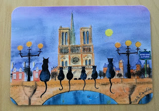 Deze kaart vond ik bij een stalletje langs de Seine en hoe erg de verwoesting van de Notre Dame ook is dit vind ik dan toch wel weer heel erg leuk; kattenpoezen die bezig zijn met de heropbouw.