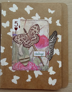 De hobbyspullen die ik in Parijs had zijn mee verhuisd en daar zat een Vintage papierblokje van de Action tussen en daar ben ik mee aan de slag gegaan. Een van de papiertjes gebruikte ik als achtergrond voor de speelkaart.